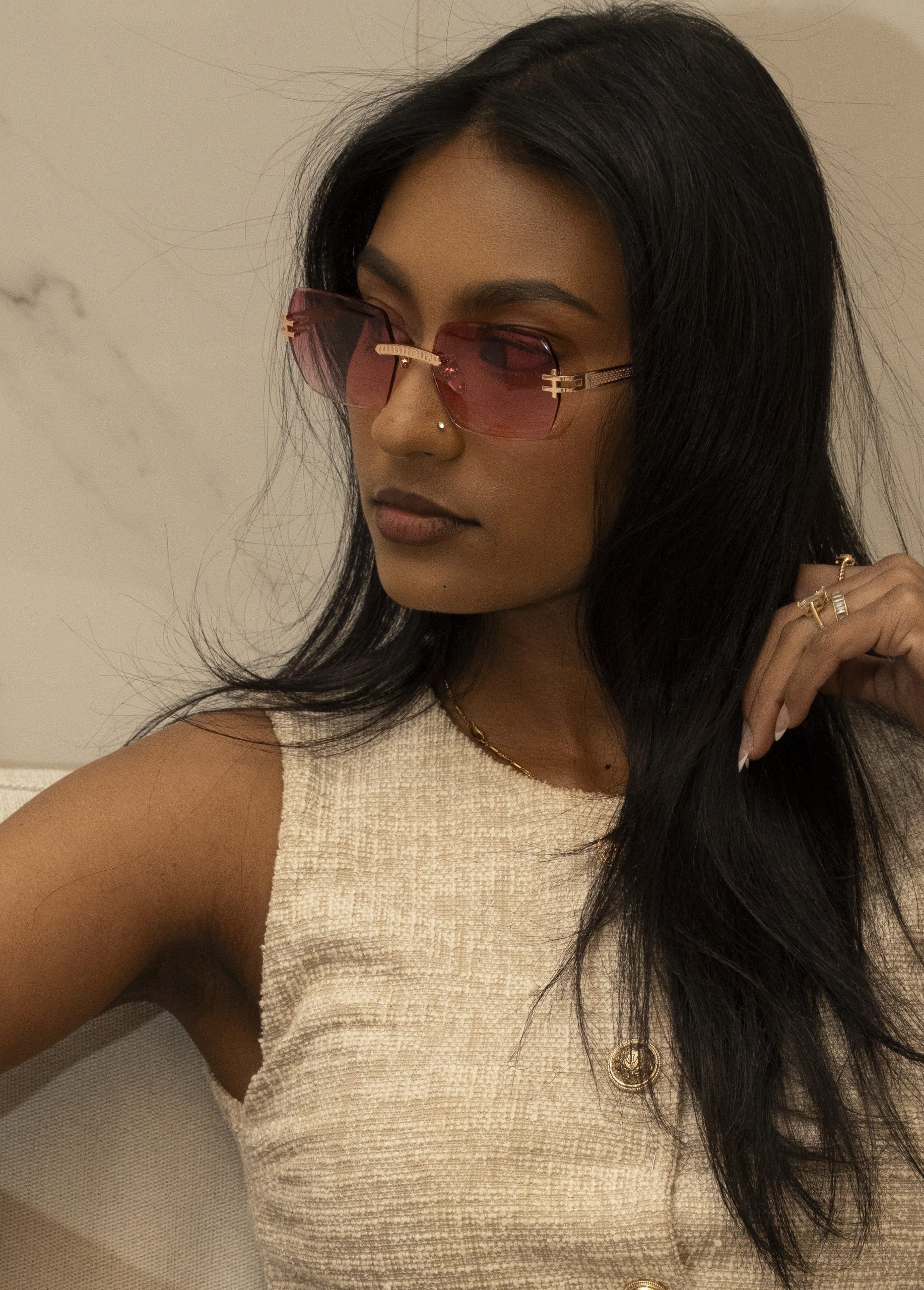 Ascend to OG status with our rimless 002 version model, marrying tradition and modernity flawlessly. Featuring a bold single thick bridge with our iconic ER logo, Beveled Hexagonal lenses, and temples intricately detailed with a diamond pattern. Customize with opulent plated finishes to reflect your unique style vision.
